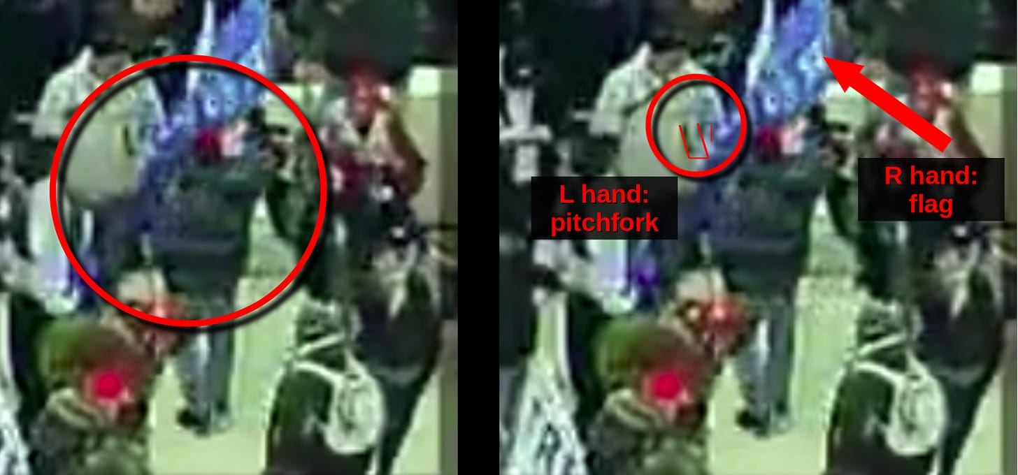 At the US Capitol, there was a locked door preventing protesters from ascending one of the four main staircases by which people were filtering up to the West Terrace. That door was eventually unlocked by a mystery person and I was the first protester through the bottom door. I was immediately surprised to discover a pitchfork lying next to the stairs at the bottom of the staircase. I had a bad feeling that if I left it alone, I would regret it. So I picked it up and carried the pitchfork in one hand and a Trump flag in the other hand (which I also picked up because I feared someone might trip on it). Then I proceeded to walk up the stairs. The flag is visible on video, but because of the pixilated nature of the only digital footage that shows me with the pitchfork, it’s hard to see. But if you know it’s there, you can tell. Now eventually I worked with other protesters to secure the pitchfork from the premises. It travels down and away from the Capitol, never to be seen again.